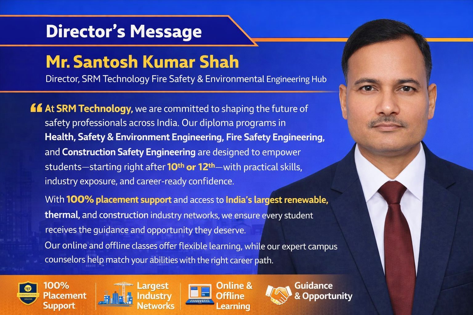 Mr. Santosh Kumar Shah Director, Srm Technology Fire Safety & Environmental Engineering Hub “at Srm Technology, We Are Committed To Shaping The Future Of Safety Professionals Across India. Our Diploma Programs In Health, Safety & Environment Engineering, Fire Safety Engineering, And Construction Safety Engineering Are Designed To Empower Students—starting Right After 10th Or 12th—with Practical Skills, Industry Exposure, And Career-ready Confidence. With 100% Placement Support And Access To India’s Largest Renewable, Thermal, And Construction Industry Networks, We Ensure Every Student Receives The Guidance And Opportunity They Deserve. Our Online And Offline Classes Offer Flexible Learning, While Our Expert Campus Counselors Help Match Your Abilities With The Right Career Path. Join Us To Build A Secure, Respected, And Fast-growing Career In Safety Engineering. Your Future Starts Here—with Knowledge, Commitment, And Opportunity.”